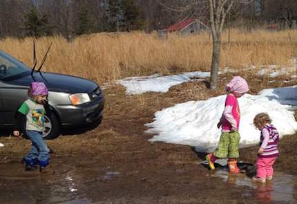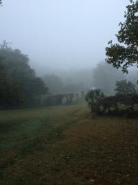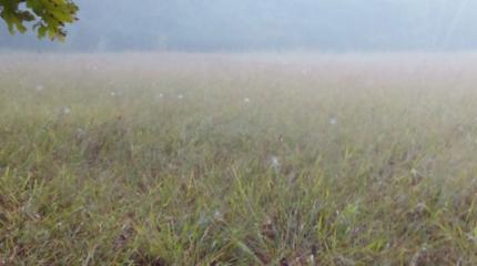 On the morning of the autumnal equinox we awoke to mist. It curled around the sunchokes and blackberries in the garden and floated amid the forest oaks and maples. In the early twilight, the mist hung like a gray gauze curtain over the lingering dark. It was not soundless, but deeply quiet. As the sun rose over the ridge there appeared in the grasses of the sheep field and in the tufts clustering at the base of the fruit trees ethereal, small dwellings, woven of pale silk. They dotted the landscape: delicate diminutive domes, cloud castles.