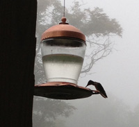 Interestingly, mist imparts startling clarity to the things close in: the trailing purple edges of the hanging spiderwort plant, the determined curve of the hummingbird's head at the feeder, the nonchalant grace of the cat licking her paws in the green deck chair. While in the wild woods beyond, all is shrouded, quiet, waiting.