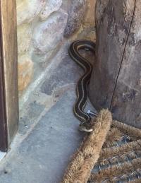 All this heat and bother is waking up the reptilian, cold-blooded creatures in our neighborhood. Scot, who seems by some charm to find or be found by such as these, has encountered (so far) a milk snake in the sheep field, a black snake in the wood shed, a ribbon snake by his front door, and a very stubborn copperhead in the woodpile. Each time Scot tried to catch this copperhead, it slipped the noose and dropped down into the woodpile, wrapped in a cloak of invisibility. Its disappearing act forced the practice of patience, as Scot waited for it to emerge and settle on top once more. This dance went through four revolutions until finally, after re-designing the snake stick, Scot was able to catch the snake and escort it far up the power line.